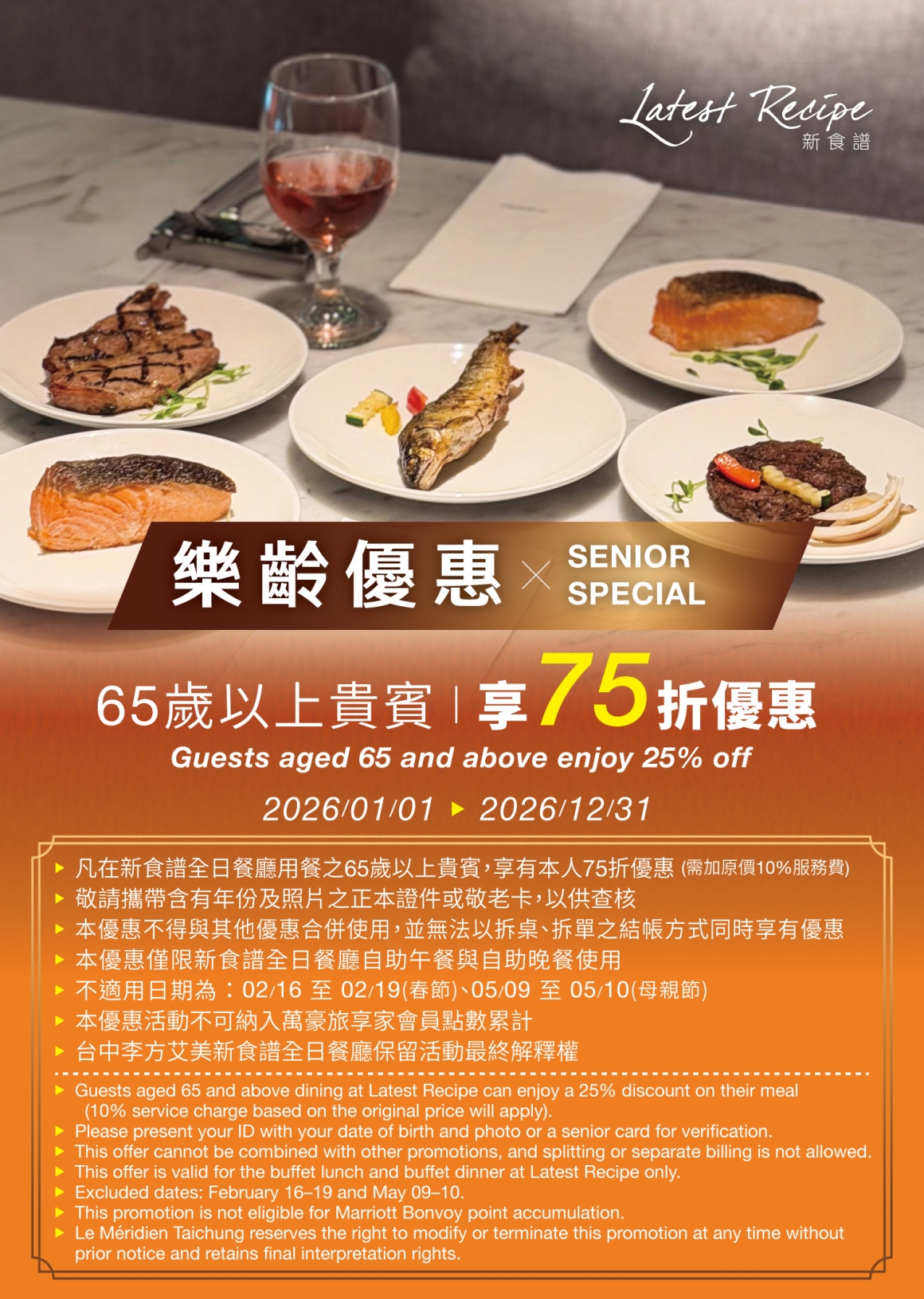 即日起至 Latest Recipe 新食譜全日餐廳 用餐之年齡 65(滿)歲以上長者 ,享有長者本人 75 折優惠(需加原價一成服務費)。