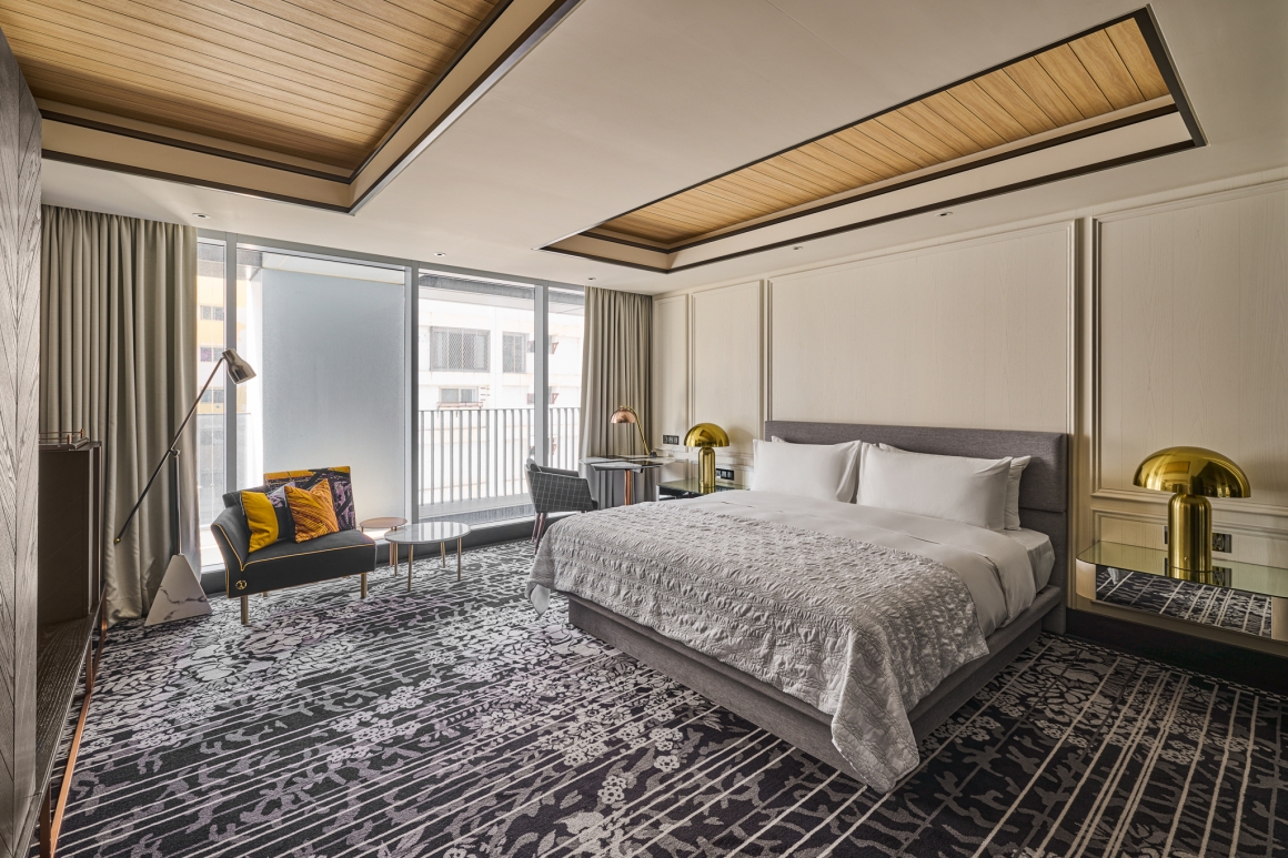 低調中體現歐洲中世紀Chic,黑白灰的空間色調點綴活力黃沙發,點亮一日忙碌後的休憩時光。大片落地玻璃窗引進自然光,讓旅客在13坪舒適明亮的空間,盡享悠閒自在的風格旅行。