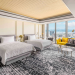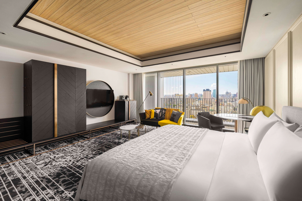 位於5-10樓的低調中體現歐洲中世紀Chic,黑白灰的空間色調點綴活力黃沙發,點亮一日忙碌後的休憩時光。大片落地玻璃窗引進自然光,讓旅客在13坪舒適明亮的空間,盡享悠閒自在的風格旅行。備有連通房可供選擇。